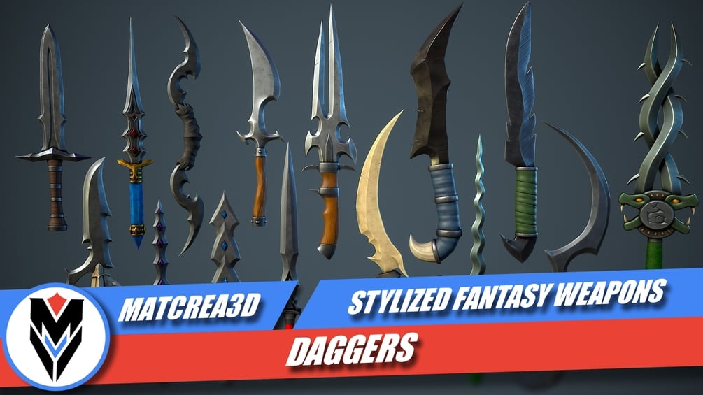 - A stylized fantasy weapon pack with 15 different Daggers.